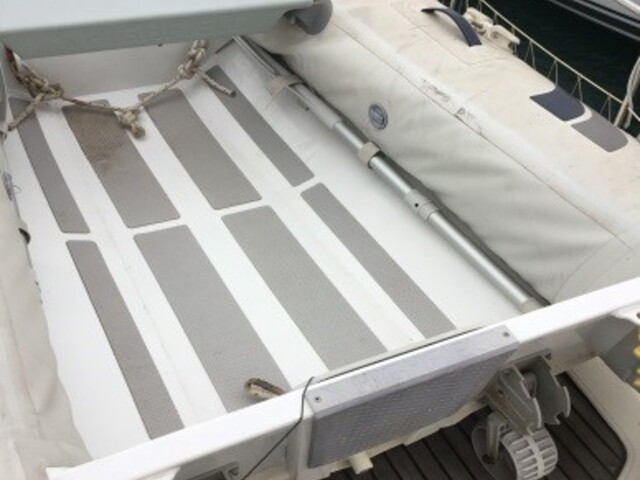 Visible dans la marina de Santa Margarida ( ROSES) en Espagne, elle peut être retirée entre le 29 mai et le 8 Juin, sinon en Juillet. Prix très bas compte tenu du collage à prévoir sur boudin tribord