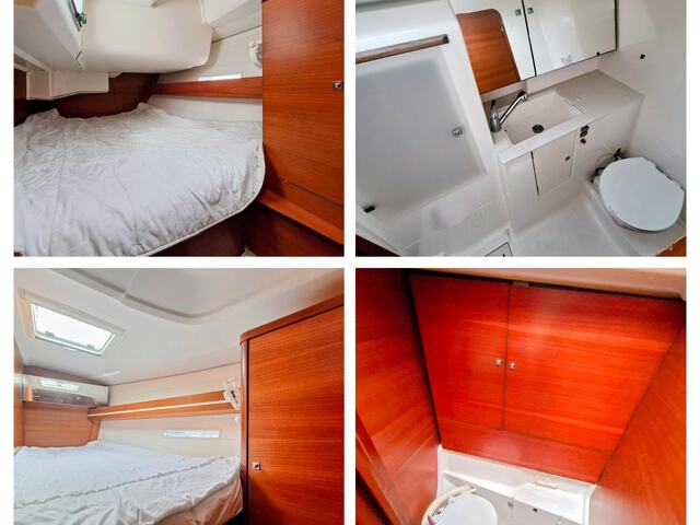 Les aménagements sont modernes, avec deux belles cabines arrières, et deux cabines doubles à l'avant, ainsi que 3 salles d'eau avec eau chaude: 1 WC et 1 douche séparée, et 1 combinée avec douche à part. Deux familles avec enfants peuvent passer une semaine agréable sans contraintes. Le carré permet d'assoir tout le monde, et la grande cuisine de régaler l'équipage.