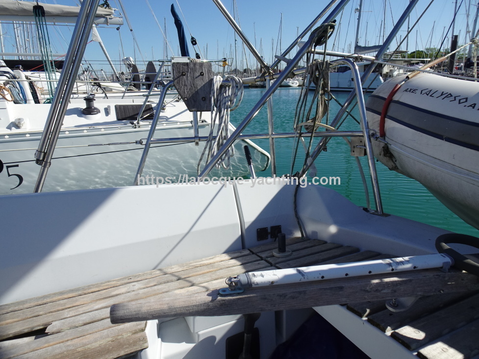 Guindeau électrique. Mouillage principal ancre + chaîne + câblot. 2 Taquets de maître-bau. Capote de roof. Bimini. Barre franche. Chaise pour le stockage d’un hors-bord. Echelle de bain. Douchette de cockpit. Davier sur l’arrière tribord, pour un éventuel mouillage secondaire. Portique arrière, support panneau solaire et bossoirs d’annexe. Emplacement à l’arrière du cockpit pour un éventuel radeau de survie.