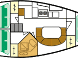 1 Cabine double avant. 1 Carré en U sur tribord. 1 Cuisine en long sur bâbord. 1 Table à carte sur bâbord. 1 Cabinet de toilette WC marins douche lavabo, arrière tribord. 2 Cabines doubles arrière.