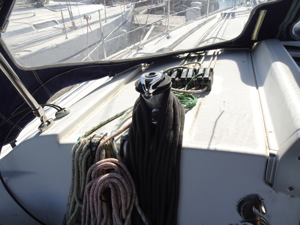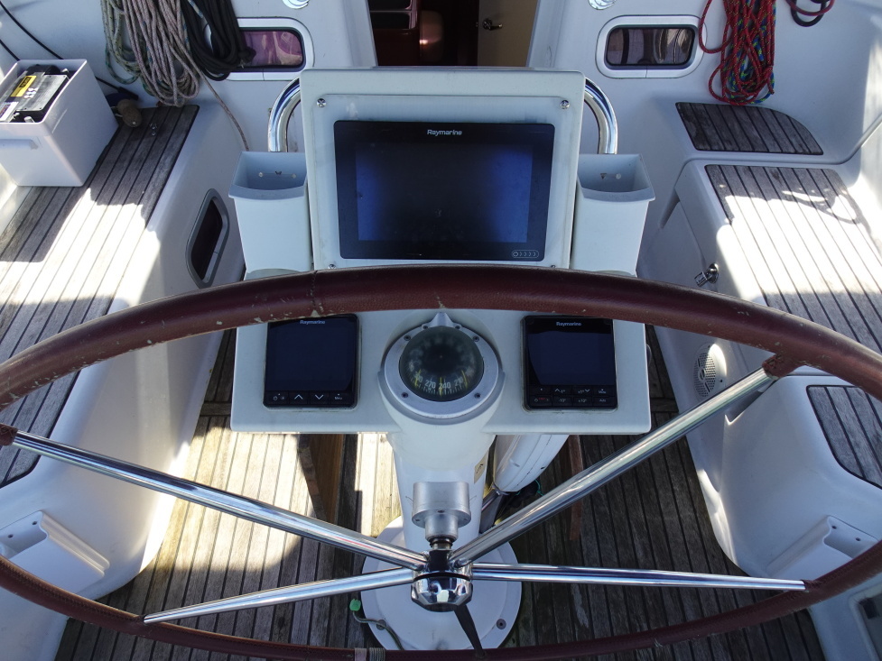 Guindeau électrique. Mouillage principal ancre plate + chaîne + câblot. 2 Taquets de maître-bau. Capote de roof, en bon état. Bimini, en bon état. 2 Winchs de piano Harken 32S. 2 Winchs de génois Harken 44ST. Table de cockpit avec taud de protection. Jeu de coussins de cockpit. Barre à roue, avec taud de protection. Chaise pour le stockage d’un hors-bord. Echelle de bain. Douchette de cockpit. Emplacement à l’arrière du cockpit pour un éventuel radeau de survie. Bancs de cockpit, fonds de cockpit et jupe arrière, lattés teck.