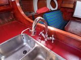 Chauffe eau, eau sous pression, pompe à pied eau de mer et douce, groupe froid usagé, gazinière ENO four, 2 feux, sellerie OK.