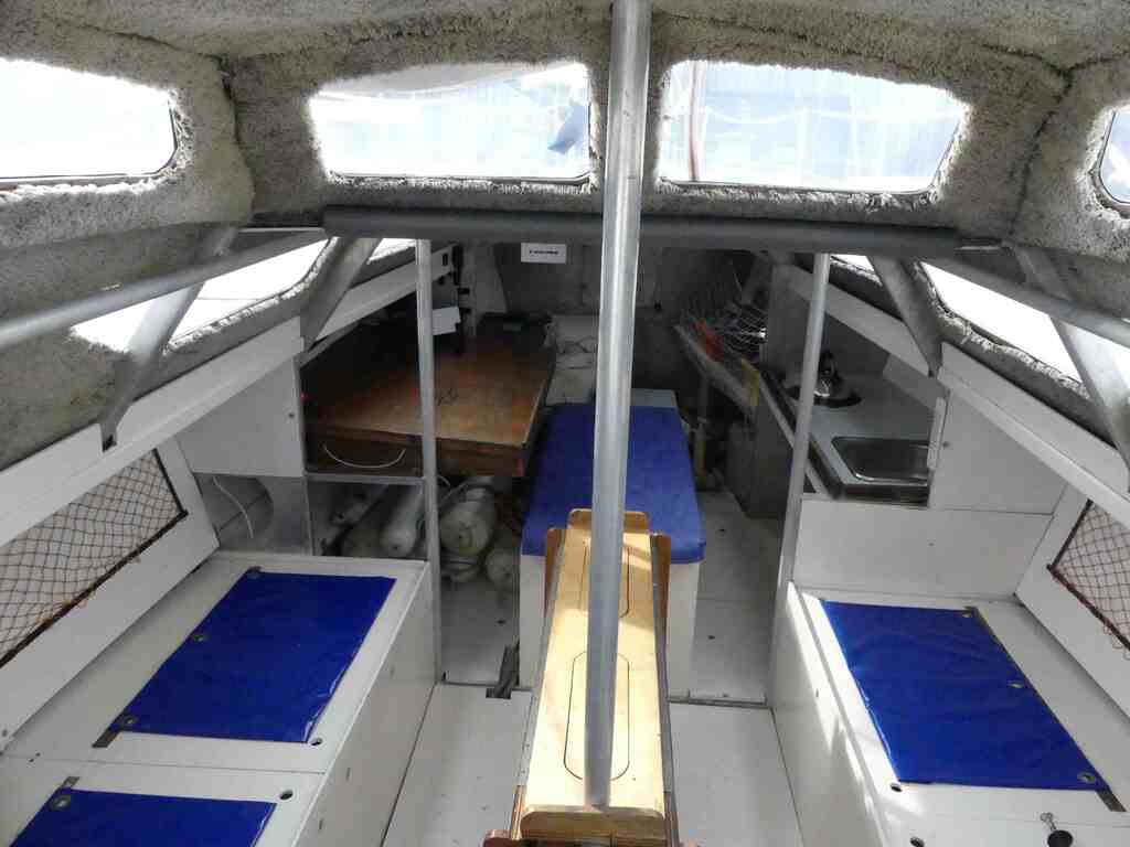 NB 1 : les emménagements sont très simples et faciles d’entretien avec un confort rudimentaire. De la poupe à la proue : deux couchettes simples derrière la descente de part et d’autre de la cale moteur (insonorisée), carré avec table repliable et deux couchettes simples, table à carte grand aigle à bbd, cuisine avec feu sur cardan et évier avec prise d’eau de mer à tbd, WC marins, deux couchettes simples, puis compartiment étanche accessible par une trappe et, in fine, compartiment étanche totalement cloisonné.