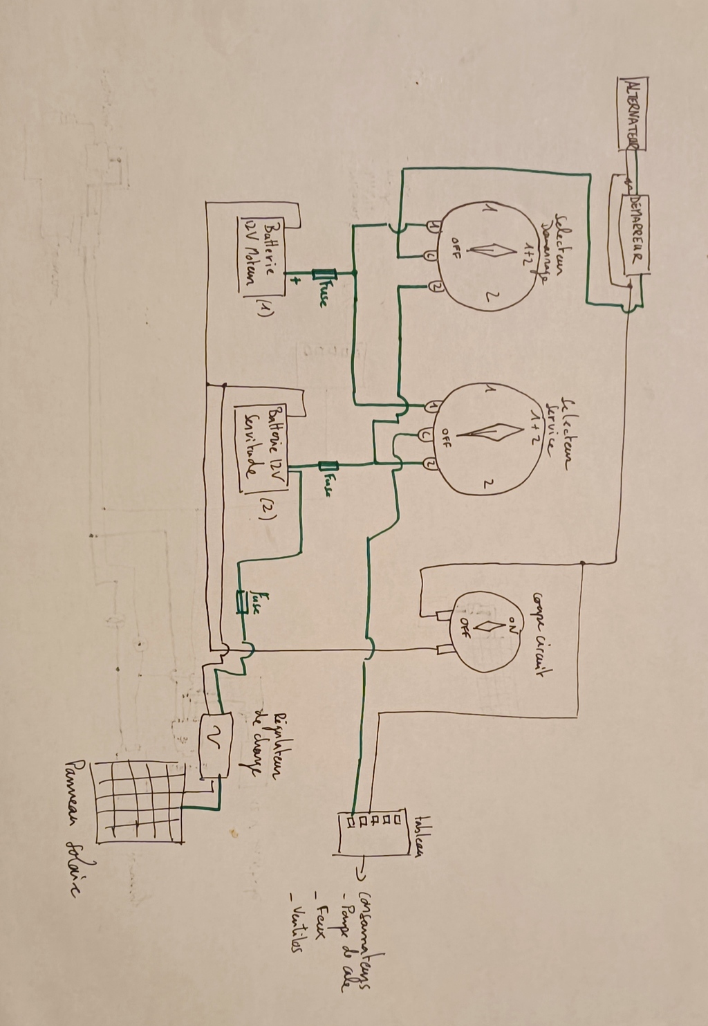 PeeFl:En positionnant les composants à leur emplacement "géographique" (cale moteur, table a carte, coqueron XX etc) et en numérotant les câbles, on y voit encore plus clair, ne serait-ce que pour calculer les sections. Tenir compte des fiches techniques des composants(Ventilation, niveau de protection, distance au niveau d'eau "prévisible"...) pour implanter tout çà. On voit trop de batteries, mélange de circuits électriques/fluides, convertisseurs etc. coincés sous des banquettes, sans ventilation, et recouverts d'un coussin qui attend la première étincelle..·le 10 oct. 10:39