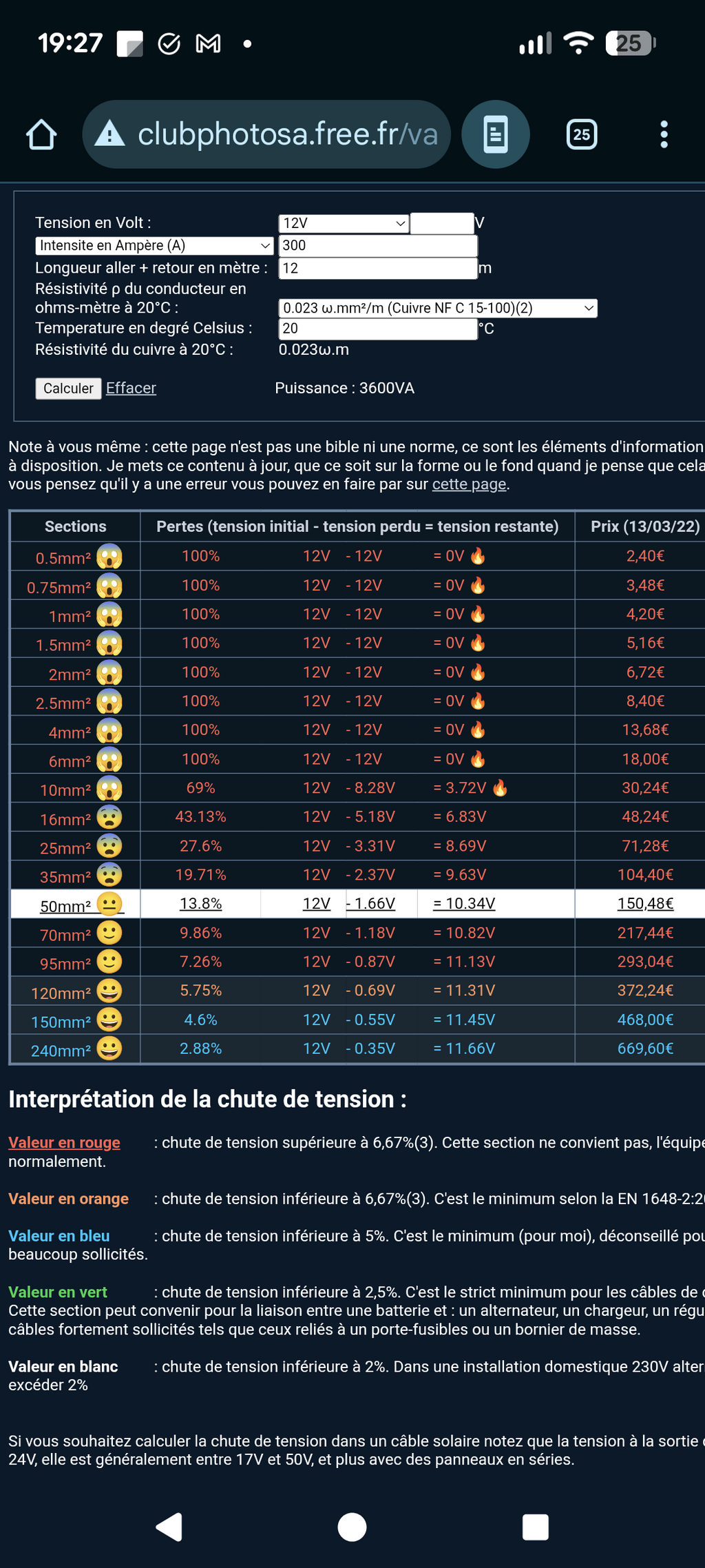pour Delices2: je suis d'accord avec toi, la perte de tension est anormale. D'après ce que j'ai compris, c'est normal d'avoir la batterie qui chute a 10.2V en charge. Mais n'avoir que 8.6V n'est pas normal. J'ai fait la mesure de tension en charge entre les deux extrémités d'un câble, j'ai bien 0.7. Donc c'est cohérent (0.7 *2 plus quelques pertes, on tombe bien a 1.5v de perte). Du coup, de ce que je comprend (et je suis nul en électricité), la seule explication est que le moteur demande énormément. En me fiant a un abaque trouver sur internet, pour avoir cette perte, il faut envoyer 300A soit 4kw. Mon démarreur étant censé tirer 1kw, j'ai une surconsommation! Pour qu'il y ai une telle perte dans le câble (neuf) faut qu'il y ai une très forte intensité.