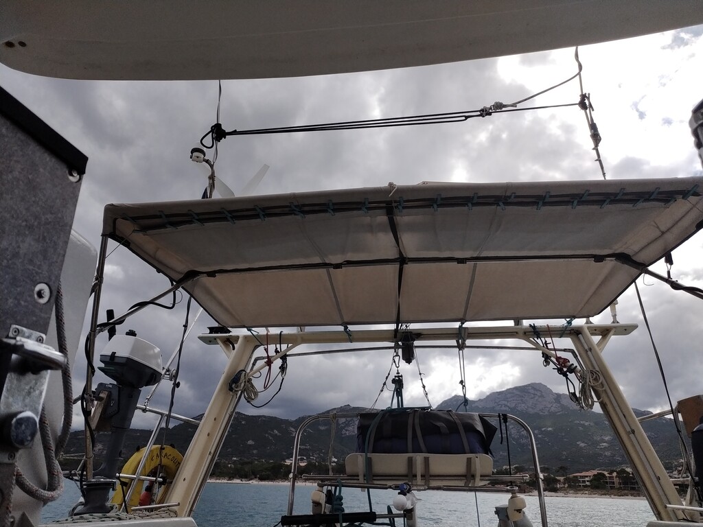J'ai également pensé accrocher l'ensemble parallèle à la bôme après blocage de celle-ci, le bas des panneaux relié aux filières à l'aide de bouts pour une bonne inclinaison (au mouillage)
