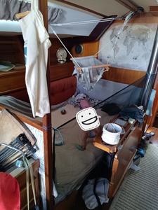 On a installé un filet dans le carré pour lui faire un parc , dans la cabine arrière bâbord et sur les filières ! Du kifff