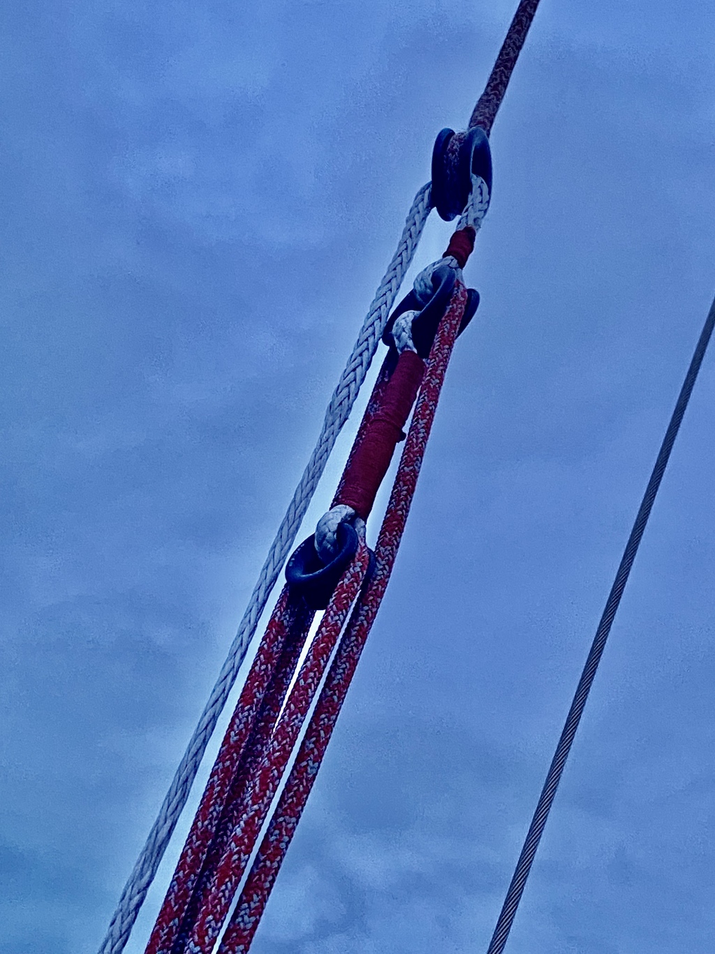 Déjà ma sortie de drisse a un angle trop prononcé il faut que j’ajoute un réa pour tirer plus droit car avec celle la j’ai un chariot tout en haut avec un dispositif pour plier la voile il y a un dyneema qui revient le long du guindant