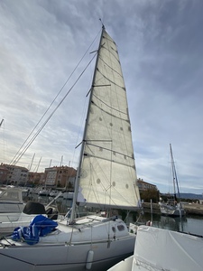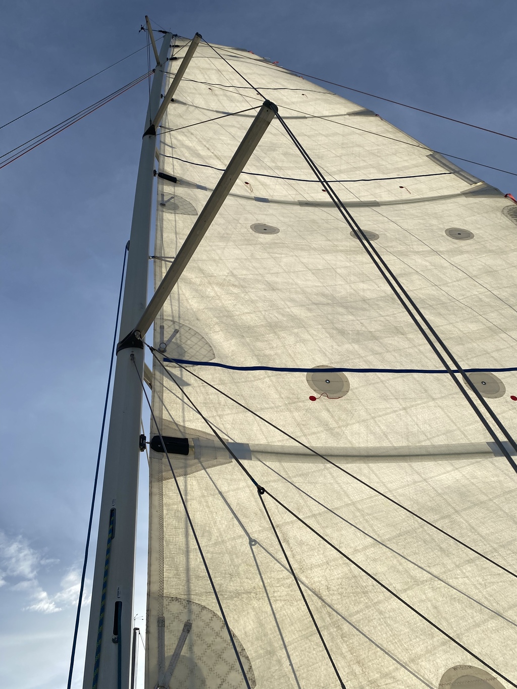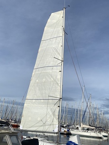 C'est un effet d'optique ou ton mât est pas mal cintré au repos ? Le trouve qu'il n'y a pas beaucoup de coulisseaux et que le guindant est un peu éloigné du mât. Ta drisse de GV est en dyneema ?