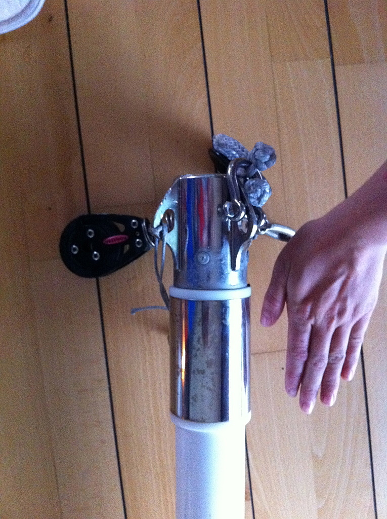 Une autre photo du mien, ou on vois (pas très visible, c'est vrai) qu'il y a deux points de fixation. Le premier étant pris par l'embout de tangon, sur la cadène d'étai largable (très solide elle).