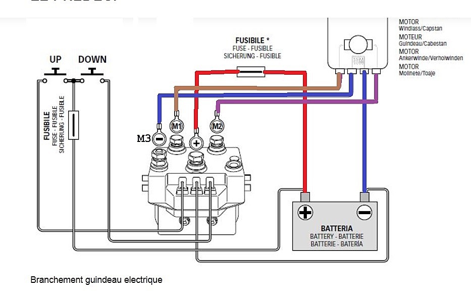 Le quatrième (qui te passe au raz des godasses !) serait l'autre négatif -12v qui part du moteur et qui va se brancher sur la borne négative de la batterie du guindeau.