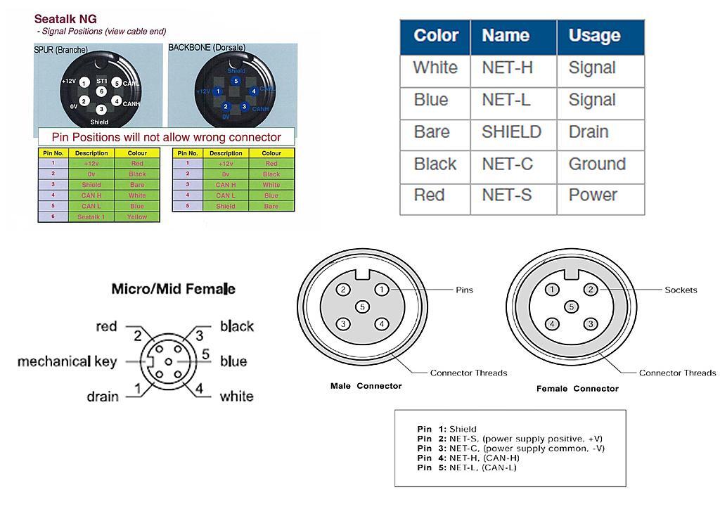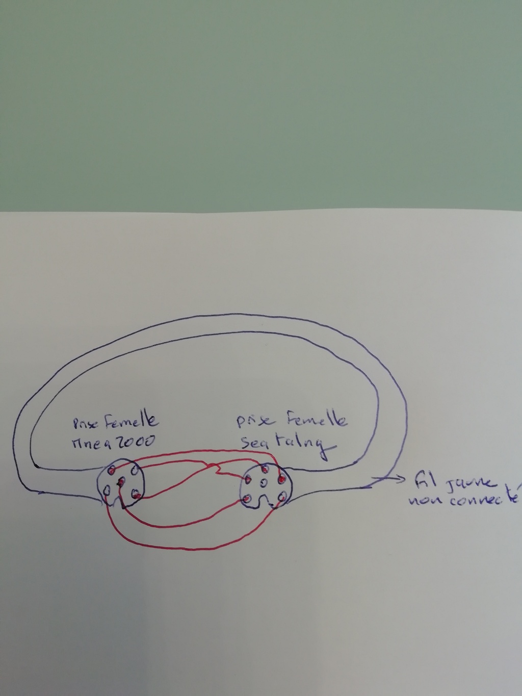 j'avais un cable passerelle entre mnea2000 femelle et seatalkng femelle qui était défectueux côté prise seatalng. J'avais un petit cable seatalkng que j'ai coupé en deux et j'ai coupé le cable passerelle du côté seatalkng pour remplacer ce côté par le demi cable seatalkng. J'ai respecté les couleurs des fils en isolant le cable jaune du seatalkng qui n'avait pas de correspondant sur le cable passerelle. J'espère que c'est ce qu'il fallait faire mais je n'ai pas testé le cable pour savoir s'il fonctionnait de peur de détériorer mon traceur ou le reseau seatalkng. Par contre j'ai sondé les fiches des deux extremites pour savoir s'is'il n'y avait pas de courcicuit entre plusieurs fiche. Je suis arrivé au schéma suivant avec en rouge les fiches en contact. Quelqu'un peut il me dire si tout est normal. Merci d'avance.