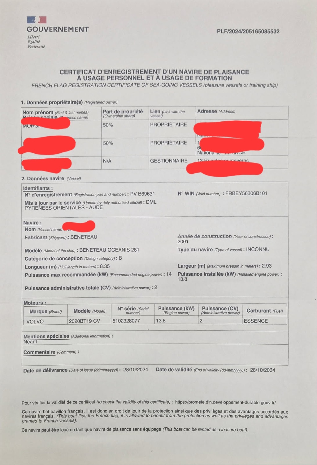 Lui nous presente un papier format A4 aussi mais l intitulé est : certificatd enregistrement d un navire de plaisance .