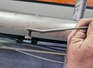 Je compte changer mes haubans et bas-haubans cet hiver car ils se font vieux (voilier Soling). Ils sont fixés à l'intérieur du mât. Ils rentrent dans le mât sous les barres de flèches via une petite encoche mais sont fixés dans le mât à l'opposé avec un embout à oeil courbé à l'intérieur duquel il y a un pas de vis, voir photos.
