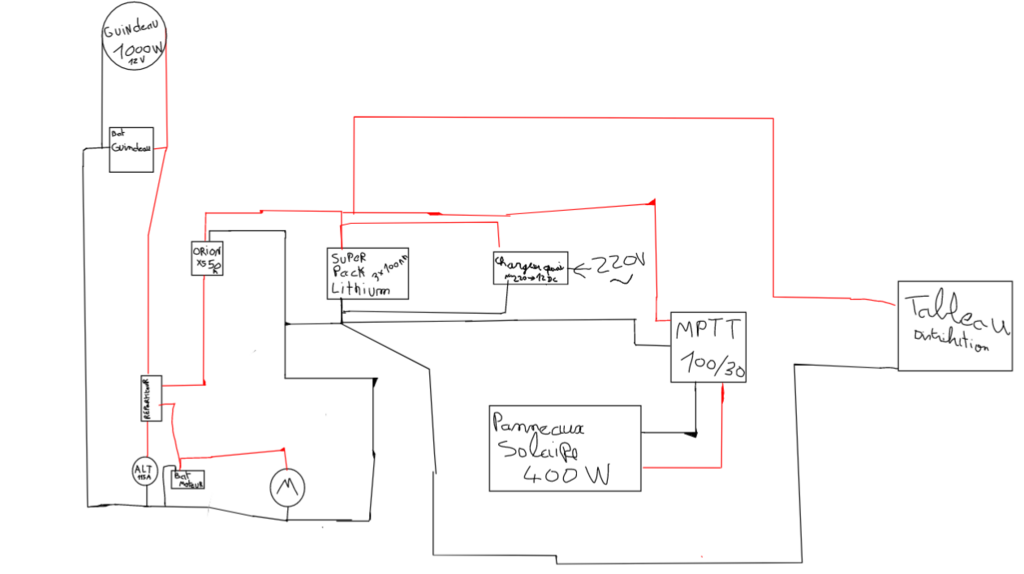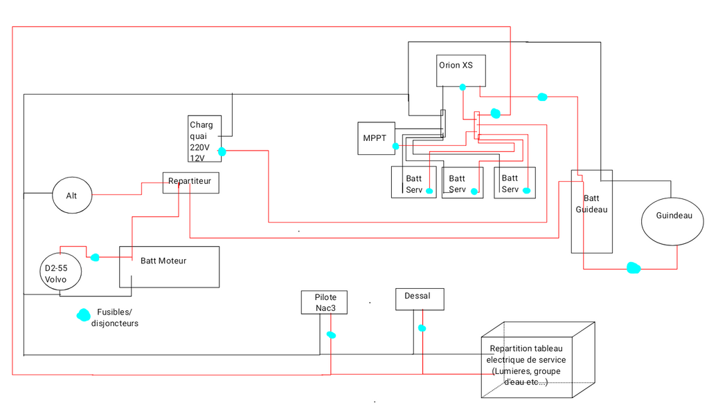 Fabien83:Salut, pour les raisons indiquées plus haut, le branchement de l'Orion sur le schéma de droite n'est pas bon selon moi. Je ferais le schéma de gauche. Dans chacun des schémas, le chargeur de quai ne recharge pas les batteries plomb. Ton chargeur de quai a une seule sortie ? S'il a deux sorties ou plus, je les brancherais sur la batterie guindeau et batterie moteur. S'il n'a qu'une seule sortie, je la brancherais sur l'entrée du répartiteur, là où est branché l'alternateur.·le 15 nov. 07:00