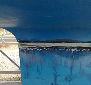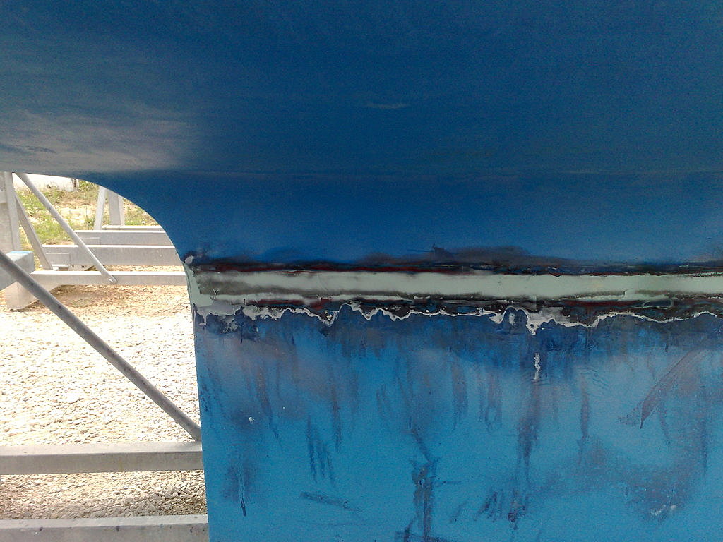 Il a commencé à baver par endroit, sans montrer trop de tenue (ondulations, cloques) et l'eau s'est inflitrée. Quand j'ai retiré le joint, des lamelles de quille sont venues avec (le métal s'effrite, voir photo).