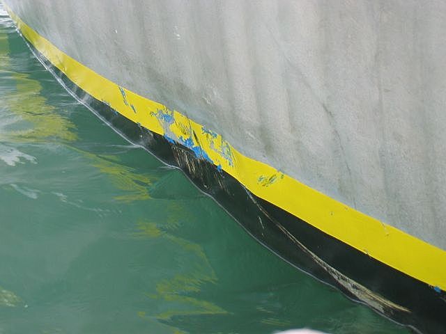Ci -joint une photo de l'enfoncement le plus important. Pas de possibilité de photographier depuis l'intérieur sans démontage. Je compte réparer au sec sur un chantier naval en Floride et espère trouver sur place de petites mains compatissantes parmis les autres voileux. ( Pour echelle la bande jaune doit faire 7cm de large.)