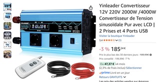 Fabien83:J'avais un YinLeader 1200W ce modèle exactement : amzn.eu[...]4PnfhPK Il a fonctionné je crois pendant un été et l'été suivant il est tombé en panne au milieu des vacances. Sans aucune explication, il était juste en train d'alimenter les chargeurs de brosses à dents. Depuis, j'ai un Victron 1200VA. Aucun souci. A côté de ça j'ai 7n convertisseur 500W 120V acheté sur aliexpress qui fonctionne nickel depuis 4 ou 5 ans pour alimenter le chauffe eau. C'est un peu la roulette russe (ou chinoise...). ·le 02 oct. 11:22