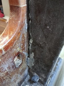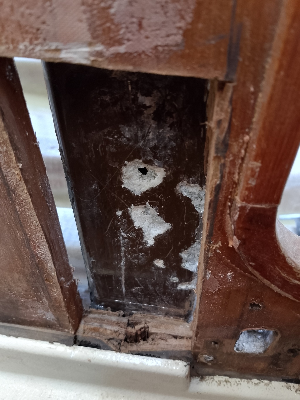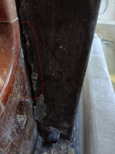 J'ai remarqué une corrosion de l'épontille. Elle n'est pas percée mais le coin près de la cloison est bien attaqué. L'épontille n'est pas flambée, et je ne connait pas vraiment de quel métal elle est faite (aluminium, possible?).