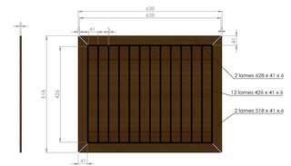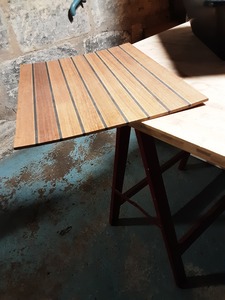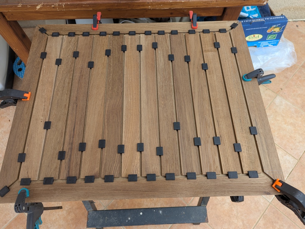 Pour le moment, j'ai fait un plan précis (je n'ai pas pris exactement la même largeur de latte pour éviter certaines coupes que je trouvais pas heureuses) et j'ai approvisionné le teck chez direct. J'ai découpé toutes les lattes et fait un montage "à blanc" sur une planche de la même taille que le coffre. Je me suis confectionné des calles pour l'écartement des lattes.