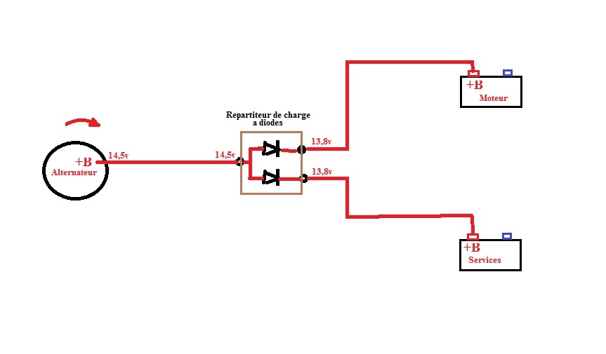 Un répartiteur de charge mofset, fonctionne sur le même principe, mais il a un minimum d’électronique et à besoin d'un négatif(-12v); point important, il n'aura qu'une perte minimum de tension de charge de 0,1v, considérée comme acceptable...
