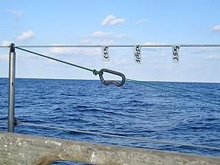un truc aussi quand tu es en nav pendant longtemps et que tu ne passes pas ton temps dans le cockpit c'est de renvoyer la ligne sur un mousqueton lui meme attaché à un chandelier par un tendeur costaud. le truc c'est de foutre ce mousquif de façon a pouvoir le voir de l'intérieur a travers un hublot... quand le tendeur est en buté sur le chandelier suivant tu es sur d'avoir un truc de plus de 5 kg ..