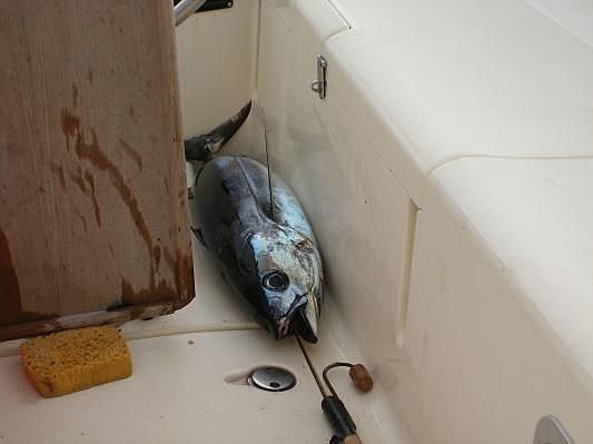 par contre, si dans l'eau, les petits thonidés ne se débattent pas, c'est pas la même musique dans le cockpit à l'inverse des daurades, qui elles se débattent bien dans l'eau, mais font plutot la planche une fois à bord