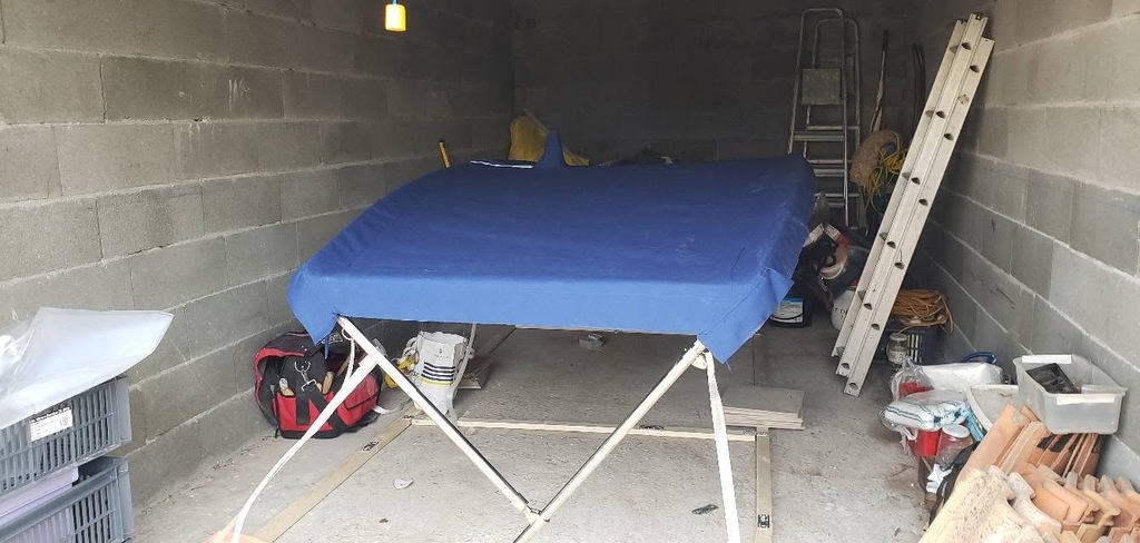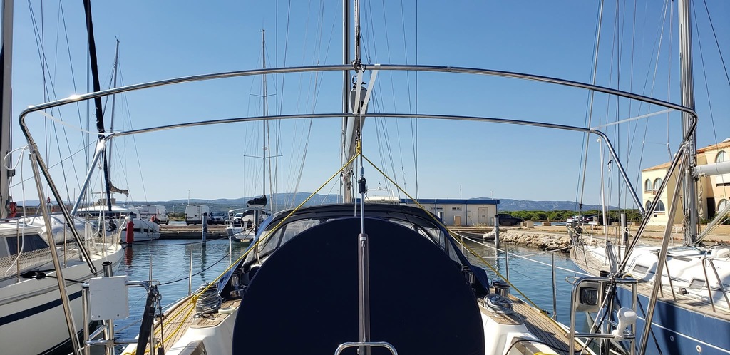 Vous remarquerez qu'il y a déjà un arceau que le précédent proprio destinait à la pose d'un panneau solaire il est bien trop haut et trop étroit pour l'utiliser pour le bimini.