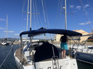 Ce dimanche, enfin une belle journée et malheureusement coincés au port pour bricoler, on a pu profiter de notre grand taud. Il est d'ENFER !