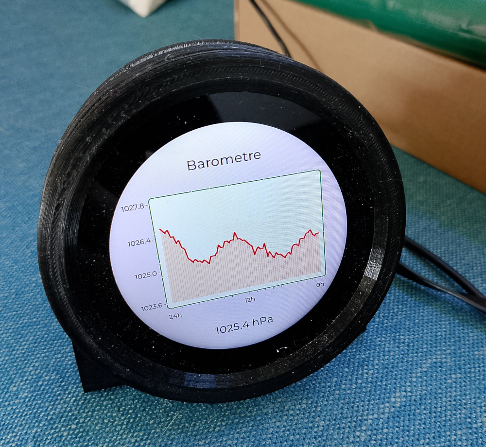 Quand à moi, j'ai ajouté une page avec un baromètre sur 24h, et j'ai imprimé un boitier en PETG et un cache anti-UV. Le pied est juste là pour les tests.
