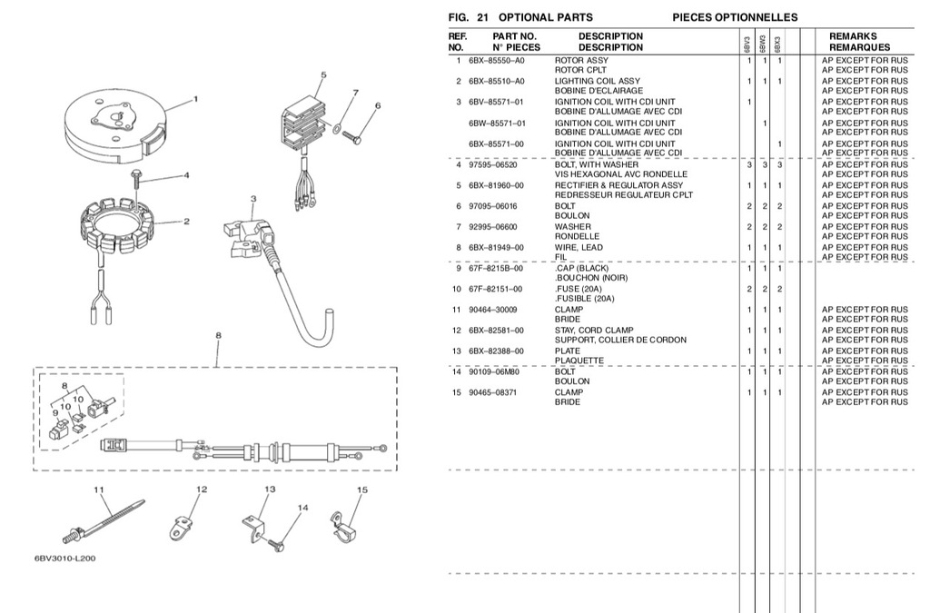La liste des options donne une référence qui s'appelle une fois "bobine d'éclairage" un autre fois générateur électrique" ou "stator", et je me perds un peu dans ce qu'il faut ajouter pour que le moteur produise du 12v à destination de la batterie du bateau.