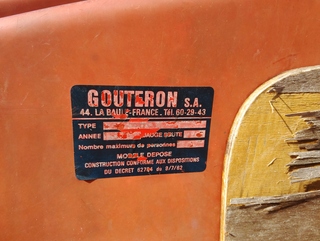 il fait 3m80 et a été produit par les chantiers Gouteron. Il a une grand voile et un foc, le mât et la bôme sont en alu. La dérive est pivotante. Il ressemble à un Zef/piaf mais peut-être en plus ventru et il a un décroché sur le tableau arrière que les autres n'ont pas. J'ignore si les voiles sont d'origine.