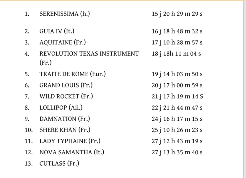 Dans cette épreuve, quatorze voiliers sont inscrits dont Pen Duick VI d'Eric Tabarly ou encore Katsou de Philippe Facque. Mais il y a aussi des Italiens, un Belge, un Sud-Africain et des Anglais…