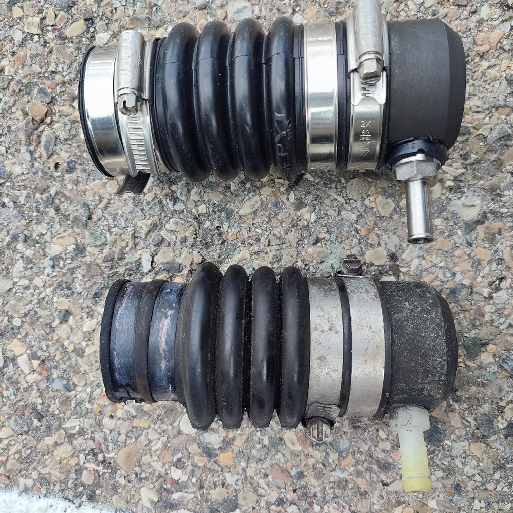 Je ne vois pas bien les photos ni la video, mais bon entre un PSS et un Stopelo (j'ai eu les deux, voir pj) c'est le jour et la nuit, il suffit de toucher le soufflet, ou meme de le comprimer car le Stopelo on dirait un accordeon, pour le pss par contre il faut vraiment y aller mecaniquement c'est tres tres costaud. Dans le dernier PSS j'ai change le soufflet au bout des annees indiquees, en le comparant avec le nouveau pratiquement aucune difference detectable. Le seul ''probleme'' pour ainsi dire, pendant l'hivernage la bagues se collent, il faut juste les desolidariser a la main quand on redemarre le moteur apres plusieurs mois.