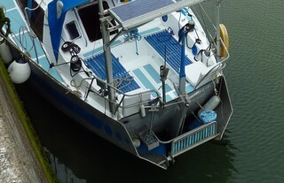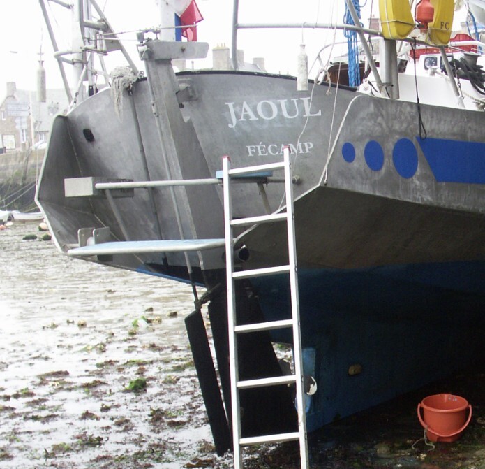 Voici la jupe de Jaoul avec sa plateforme basculante pour embarquer en annexe. Un davier inutilisable, une boite à chaine pour mouillage arrière (utilisée souvent). Je n'ai plus ce bateau. Il s'appelle Swing dorénavant.