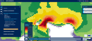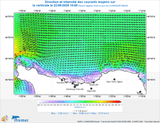 puis il y a le modele MARS2D de l Ifremer qui arrive pour les zones cotieres a une grille de 250m et pas horaire de 15minutes, ici le forcage meteo arrive jusqu a Arome (donc grille plus dense que Arpege), integration de la surcote, il y a en plus assimilation, donc des mesures reelles sont integrees regulierement pour corriger/ameliorer les courses du modele (ils citent mesures par satellite et le radar en mer d Iroise); les donnees de courant rendues disponibles par contre sont une moyenne sur toute la colonne d eau.