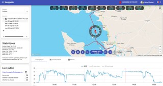 Sailgrib propose un truc très intéressant : l'enregistrement de toutes les données NMEA, et le transfert automatique (dès que vous êtes connectés à Internet) sur un site web (Navygatio), qui permet de visualiser la trace sur une carte (malheureusement pas une carte Marine, mais je pense que les devs pourraient le faire) et les données via des courbes, avec en plus calcul de moyennes glissantes pour plus de lisibilité.