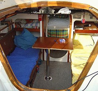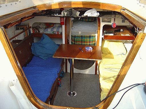 Non je ne m' embourgeoise pas, j en ai deja une a bord mais elle est un peu trop petite, du coup, meme a deux on ne peut pas trop poser les coudes ( oui je sais, ca ne se fait pas, mais pour bouquiner, c est pas mal ), alors, une fois qu il y a les deux assiettes, le plat dessus, les verres, la bouteille, etc etc, ben rapidement on renverse tout.....