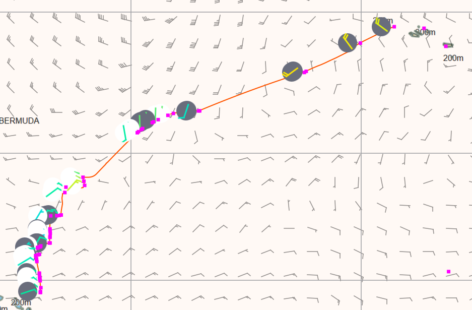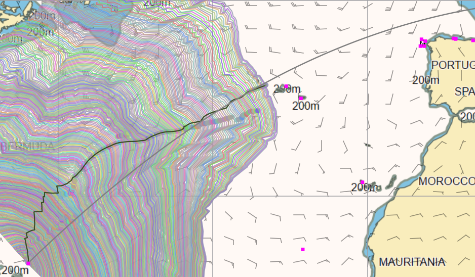 Routage sur les 16 prochains jours en partant de sa position actuelle. On voit que c'est assez erratique, jusqu'à attraper la courbure de l'Anticyclone des Acores. Ensuite ça rejoint l'ortho (bon, les prévis à 16 jours, c'est un peu la loterie)