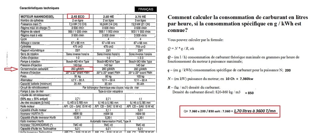 PeeFl:Rien a voir avec ce qui est attelé au moteur, il s'agit de la consommation spécifique. Après ça, le rendement de la distance parcourue/litre dépend du bateau, de l'état de la mer et du vent. Sur sa fiche technique, Nanni indique 200g/kw/h soit 145g/ch/h. 1.7 l/h comme le calcule Mamita. ·le 24 nov. 10:09