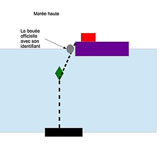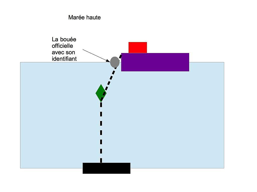 A marée haute la hauteur d'eau est plus haute que la distance entre la bouée et le fond, dont c'est vertical, la bouée coule et tire , le bateau est proche de la bouée