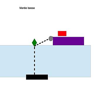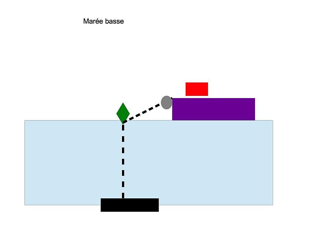 A marée basse la hauteur d’eau est identique à la longueur de la chaine, le bateau est un peu plus loin.