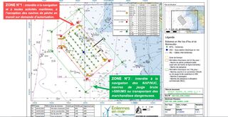 J'en profite pour vous montrer les couloirs de traversées en orange et la zone de pêche en bleu au NE. Lzes zones rouges sont interdites à la navigation.