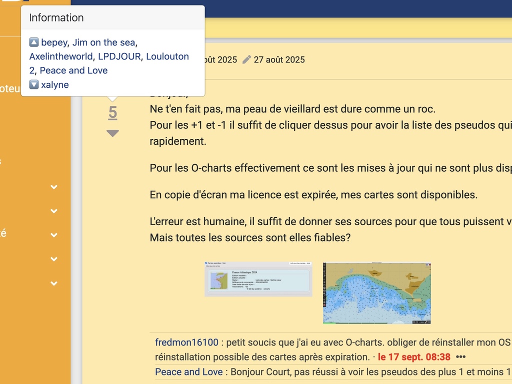 Pour voir les +1 et -1 sur un post il faut juste avoir la licence H&O ce qui n'est pas gratuit, c'est moins cher que les cartes Navionics de Garmin.