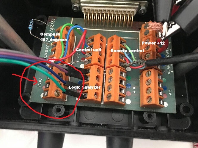 Quitte à changer de girouette, autant essayer d'en mettre une qu'il pourrait connecter à son calculateur. La girouette préconisée à l'époque ne se vend plus bien sûr. Dans le calculateur, le bornier destiné à la girouette (VANE) a 4 plots (Bleu, Vert, rouge, blanc), voir photo. Que peut on y connecter ?