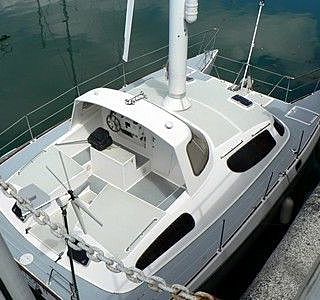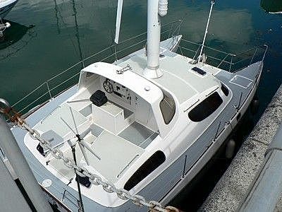 Il y en avait aussi un cata de même taille équipé d'un éolienne à axe vertical dans le Solent.