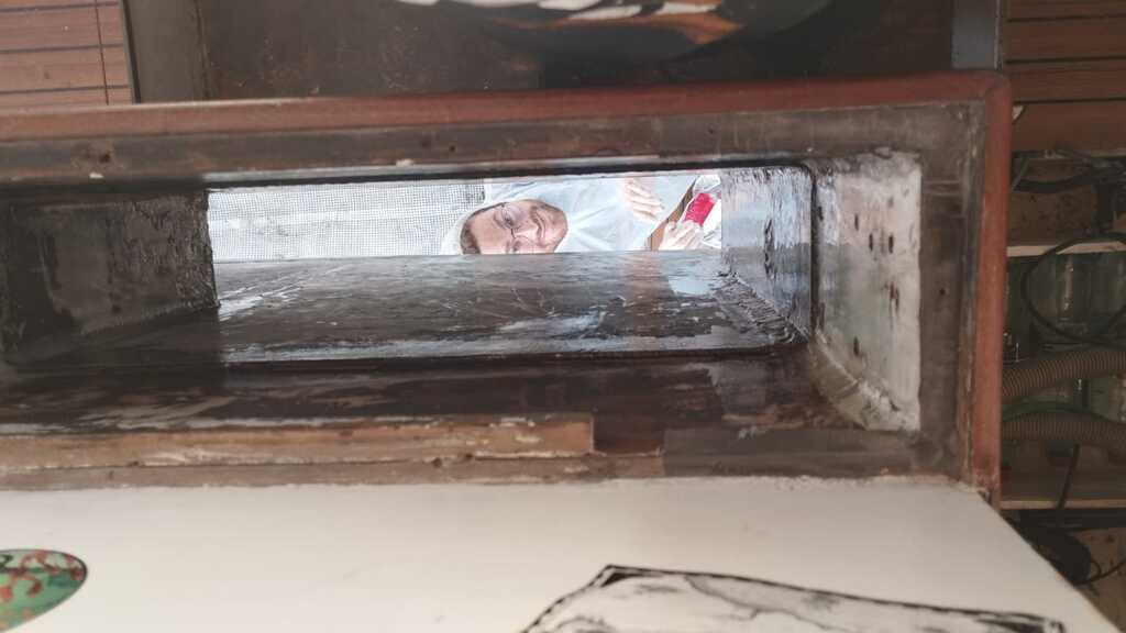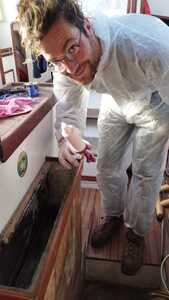 Puis ponçage de l'extérieur du puit(dans le bateau quoi), enlevage du bois pourri ça imbibé, et séchage intensif du bois.