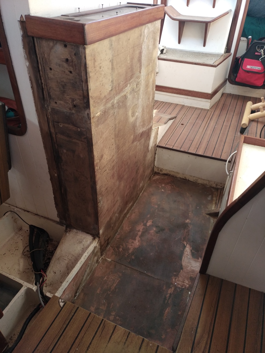 Pour info le suintement part de l'angle entre la face verticale et la pente qui descend, coté droit (tribord, donc, à coté du meuble cuisine)