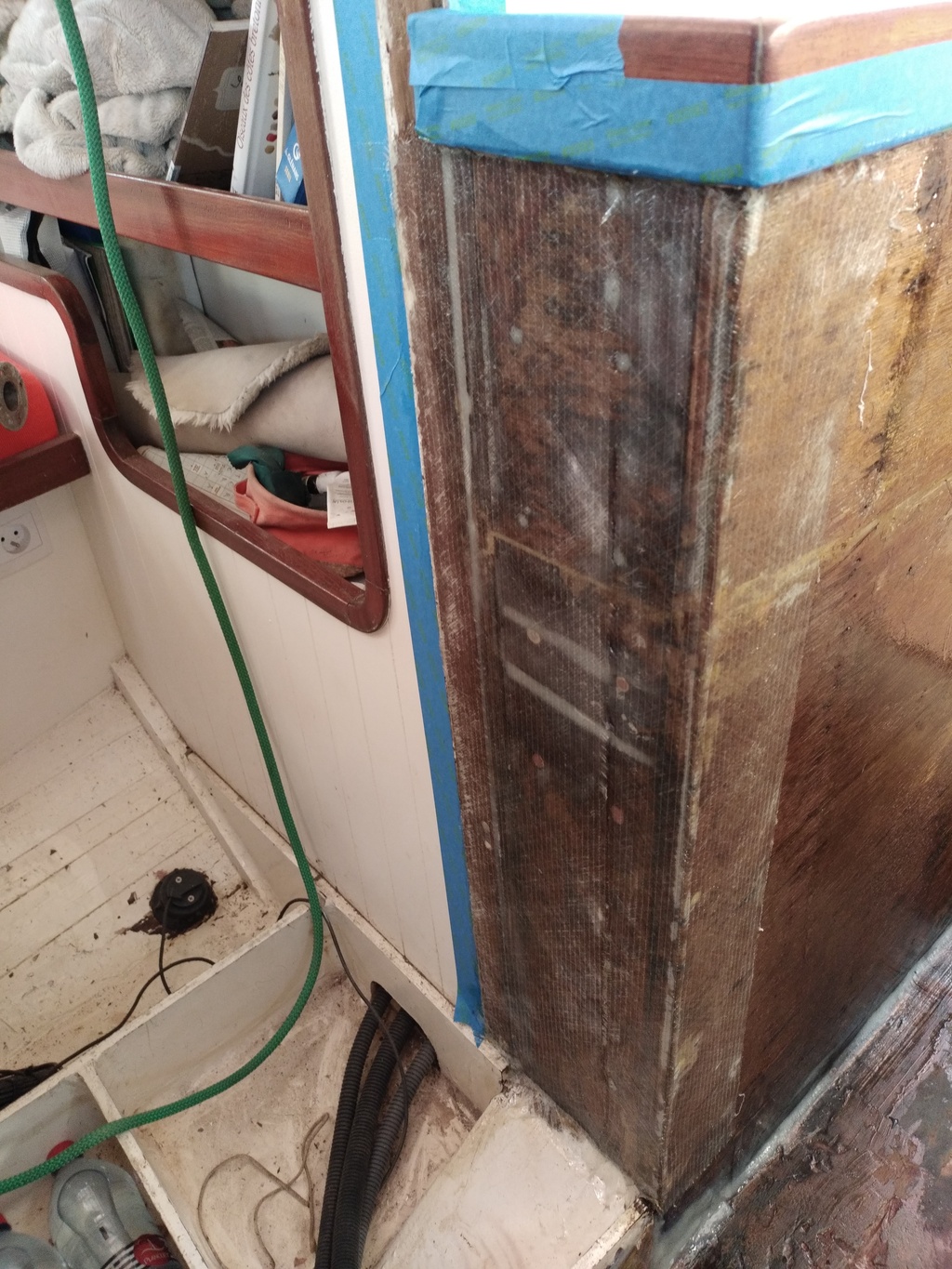 J'ai fait ensuite une imprégnation époxy de tout le bois apparent, de nouveaux joints congés à l'intérieur et une stratification époxy à l'extérieur.