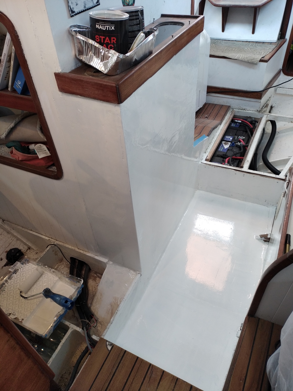 Pour finir, 2 couches de primaire époxy et anrifouling matrice dure dans le puit, et lissage époxy chargé puis primaire mono composant et toplac pour l'extérieur du puit.